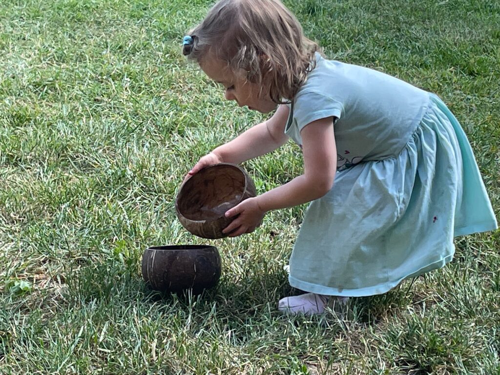 Anebo prostě pořiďte pár talířků a lžiček a uvidíte, jak dítě umí improvizovat a začne vařit třeba na schodech nebo na nějaké zídce. U nás vznikla bramboračka a písková polévka – stačil písek a trocha starého nádobí. Z dřívek masíčko, z trávy špenát. Prima! Hned víte, co vařit zítra.